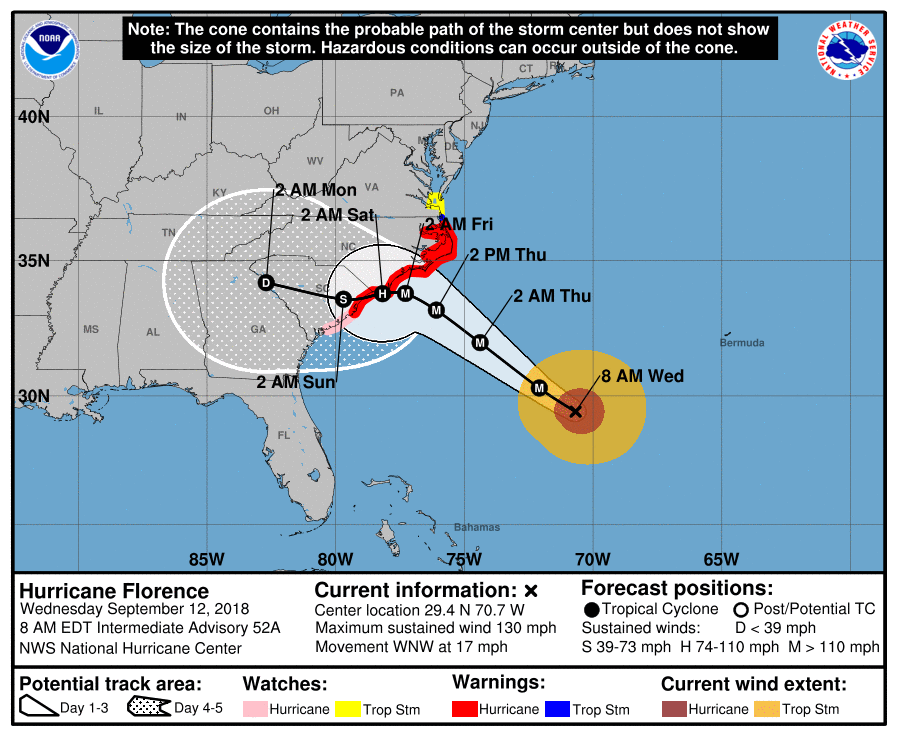As of 1200 UTC, the NHC said Florence was some 530 miles southeast of Cape Fear, North Carolina, with maximum sustained winds of 130 MPH, moving to the west-northwest at 17 MPH.